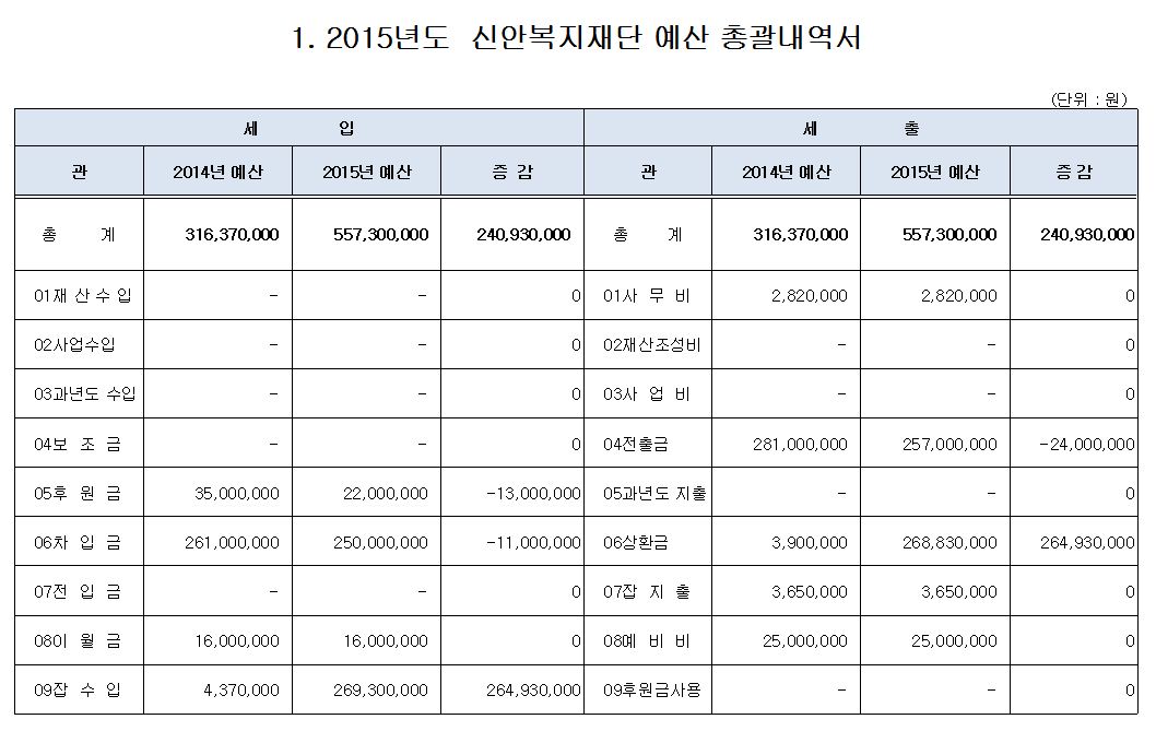 신안복지재단 2015년도 예산서를 공지합니다.